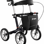The large 11 inch soft wheels absorb bumps and vibrations on rough ground. They roll quietly indoors too. The overall width is 65 cm so it fits through standard doorways. Whether you are walking on a country trail or shopping in town, this rollator handles both with ease.